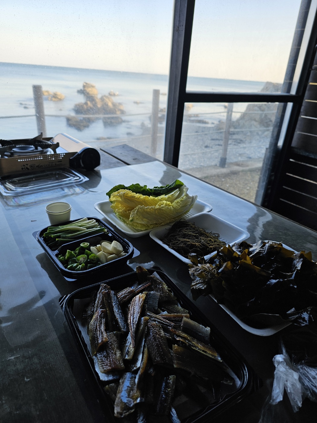 짐을 먼저 풀어놓고 시장을 다녀오기 위해 입구에 있는 매점에서 사장님께 키를 받아 문을 열고 들어가는 순간 깨끗한 동해바다와 그걸 방에서 몇 발 안 되는 거리로 볼 수 있는 뷰가 너무 좋아 웃음이 나왔다.