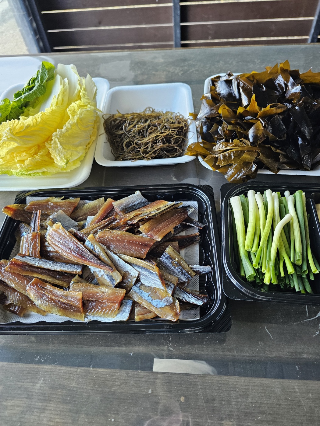 배고픔에 당장이라도 쓰러질 것 같던 우리는 처음 와본 구룡포 시장이지만 여기 어딜 가도 어차피 다 똑같다며 들어가자마자 눈에 보이는 가게에서 과메기 야채세트 소, 가리비 2만 원어치를 산 후 시장 구경 따윈 사치라며 굶주린 배를 부여잡고 블루밍으로 다시 출발했다.