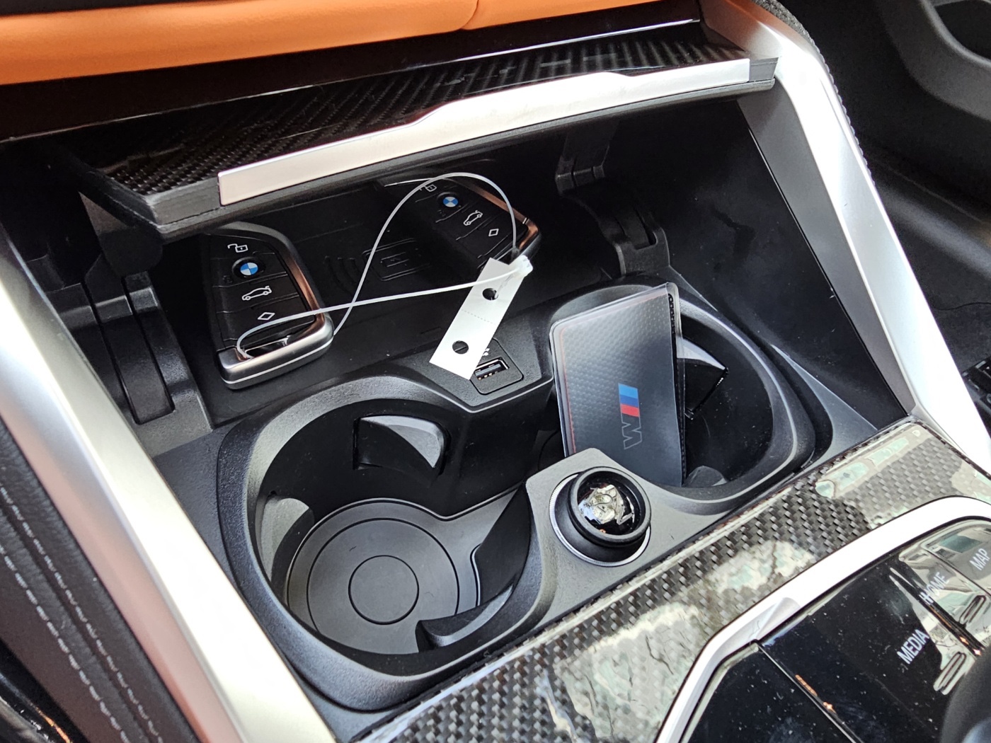 핸들에는 M차량 전용 빨간 M1, M2 버튼이 있는데 엔진, 새시, 핸들, 브레이크를 커스텀으로 설정해서 M1이나 M2에 저장함으로써 버튼을 누르면 세팅된 상태로 바로 변경되도록 하는 버튼인데 자그마한 빨간 귀가 너무 귀엽다.